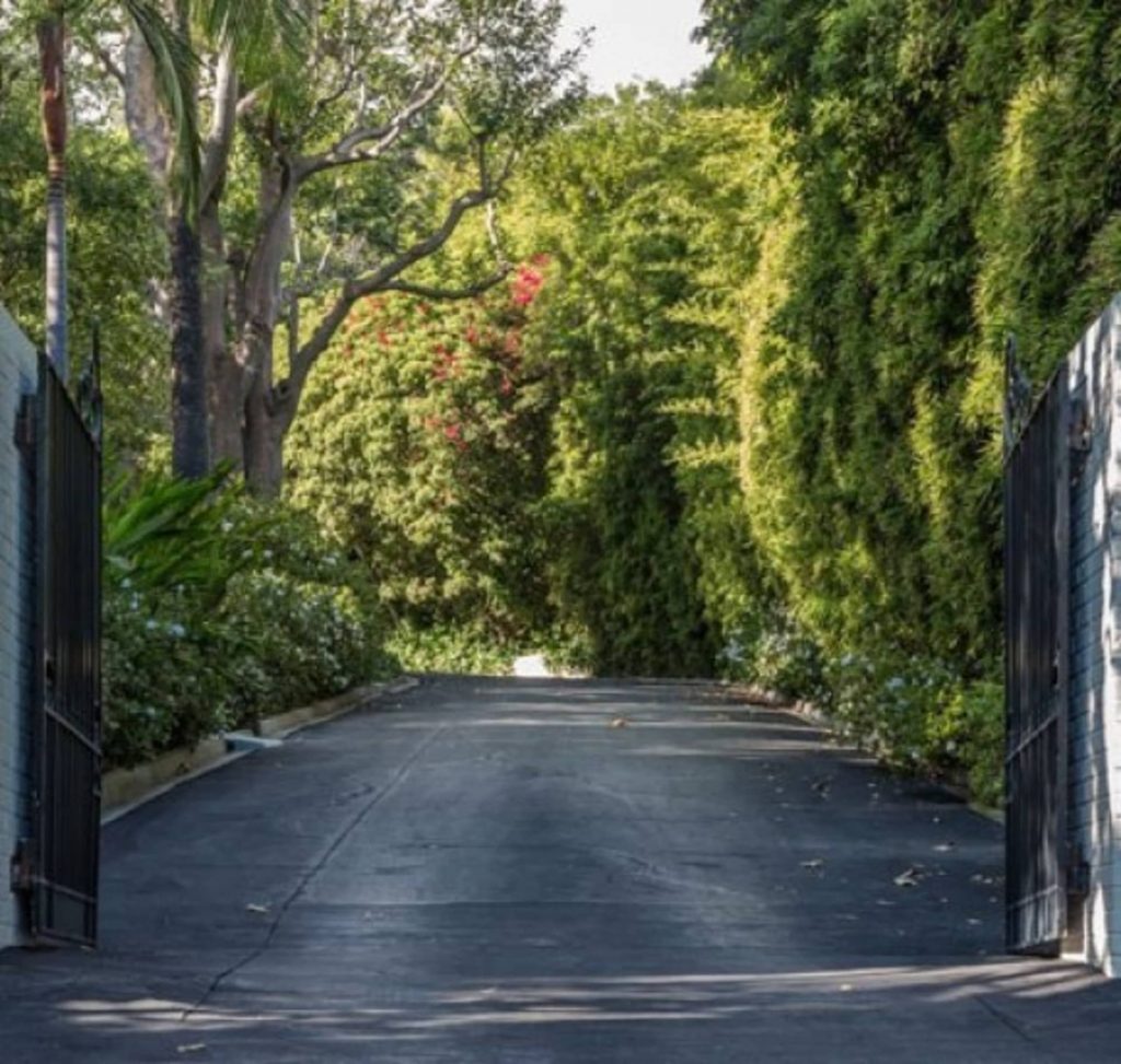 The storied estate is situated on 3.63 acres inside the exclusive East Gate of Old Bel-Air enclave. Residents are greeted by a grand gated entryway that leads down a long private driveway.