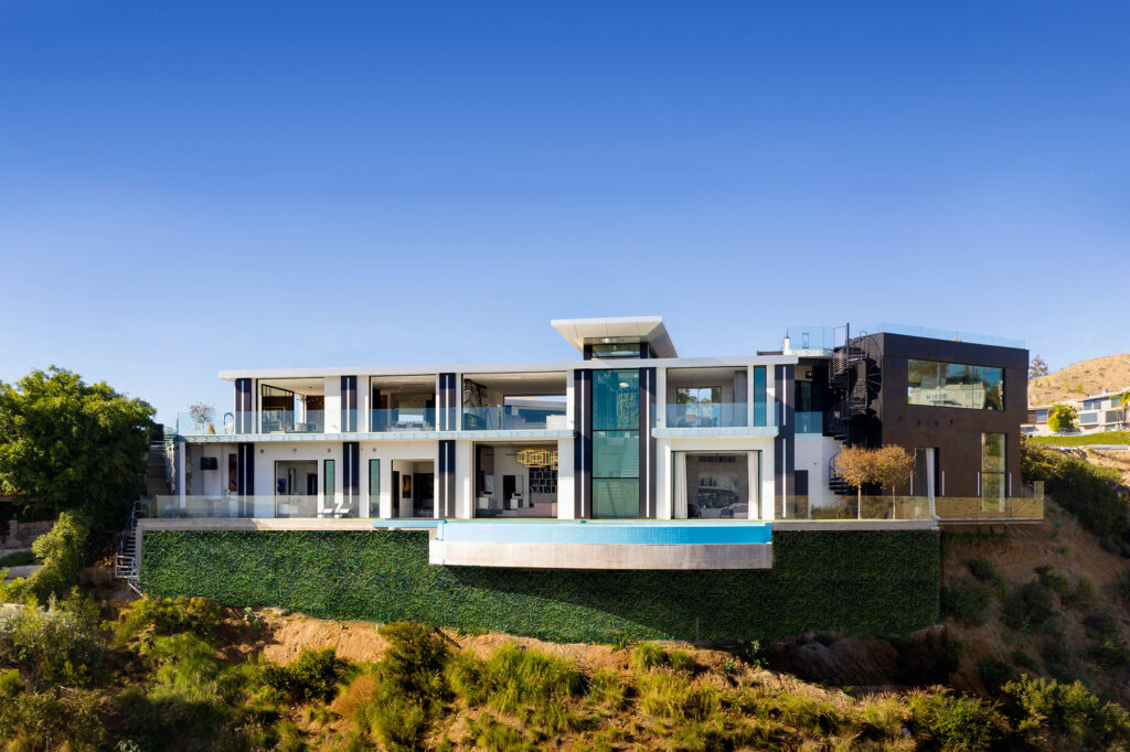 Situated atop a private bluff overlooking virtually all of Los Angeles, the estate is the brainchild of celebrity architect Michael Mueller, who spent more than eight years on the project (the permits alone took two years to secure!) before it was finally completed in 2019. He detailed to Forbes, “Back in 2003, I was driving around looking for properties up in the hills and I came across this tiny little sign at the bottom of the hill that said, ‘For sale by owner.’ So I rang the buzzer. Someone came down the hill. Mind you, there was no house here; it was just all mountain. And guess who it was? It was Leslie Nielsen!” The “Naked Gun” actor, who had owned the lot since 1951, was apparently supremely protective of it, only agreeing to sell to Mueller after interviewing him four times and being made privy to his ambitious architectural plans, which required a “carving out of the hilltop to create the most impressive views in Los Angeles, sweeping across the skyline and mountains to the ocean.”