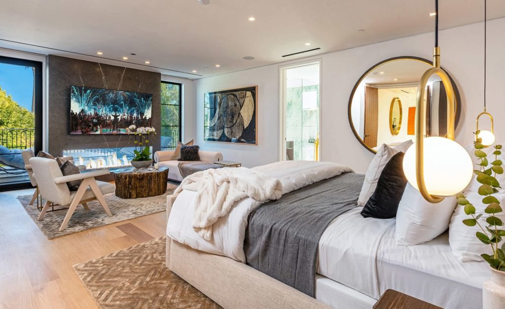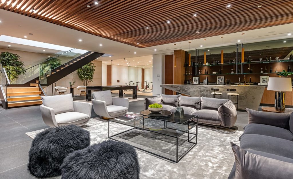 Nevertheless, many of the custom details inside mirror the kind of showmanship seen in Los Angeles’s flashiest new developments. Such flourishes include a grand staircase in the double-height skylit foyer, a dramatic slab marble kitchen island, Hermés wallpaper and the aforementioned backlit marble installation in the basement lounge.