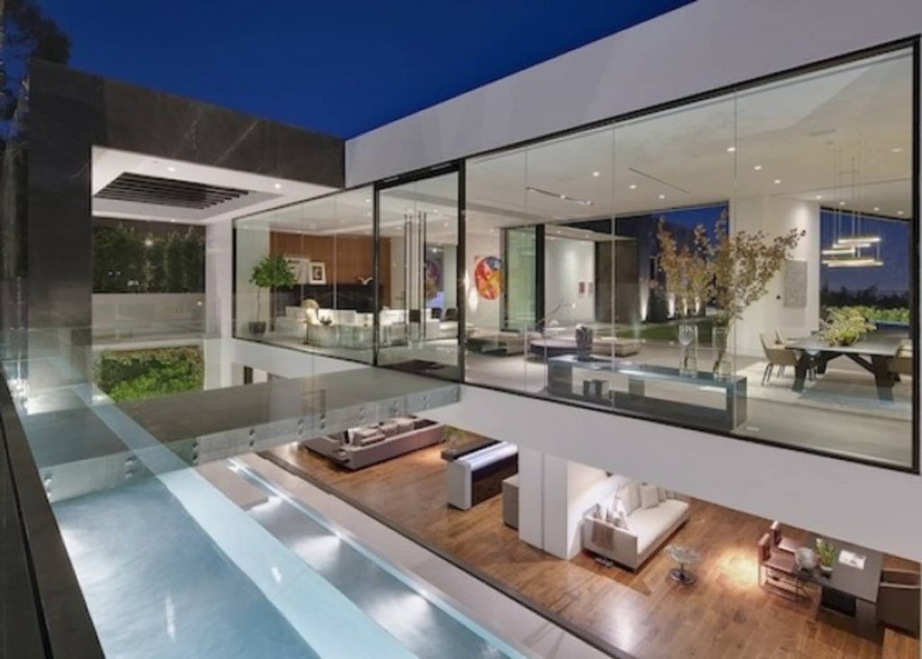 Featured in the second wing’s upper level is a comfortably-sized master suite, with custom-built walk-in closets and attached dressing area. The bedroom’s glass walls open to pool and outdoor seating area with fireplace, offering southerly views from Century City to downtown.