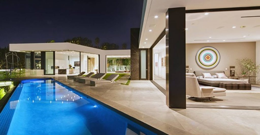 The home, perfectly poised for entertaining, includes a Striking “Water Lounge” with a bar and fireplace overlooking cascading double height water feature and living walls. A luxurious screening room that seats twelve guests to start the evening is included, including state-of-the-art technology by Crestron. The home has the perfect sky deck for large scale events with jetliner views. The listing price is $32,000,000.