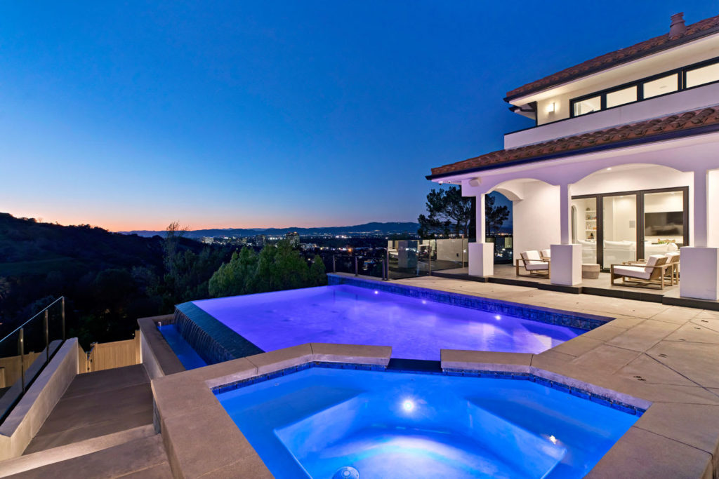 Perched high on a ridge with sweeping mountain and city views, the Sherman Oaks property is unique for the area because of its scale and usable space, according to listing agent Anna Marie Simpliciano of Hilton & Hyland. Sitting on three-quarters of an acre, the estate includes a Mediterranean-inspired contemporary house of about 8,500 square feet, a spectacular infinity-edge swimming pool, an outdoor kitchen and a large grassy field.