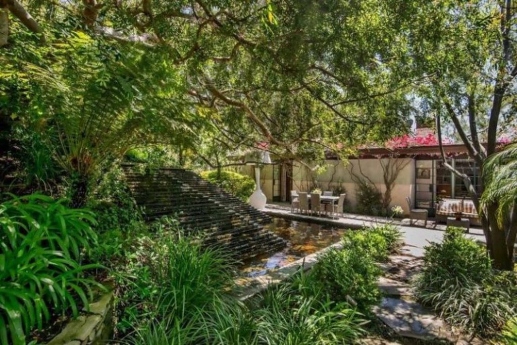 The recently-remodeled chef’s kitchen is flooded with light and features a large center island, six-burner Wolf oven, double SubZero refrigerator/freezer, skylight and large service pantry. The outdoor space is graced by a Mayan-inspired fountain and Koi pond, glorious landscaping, and tranquil streams, which flow graciously over nearly a half-acre of land.