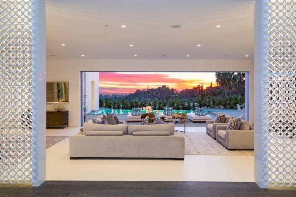 Chic and sophisticated, this dynamic modern home by DIJ Group features Fleetwood windows that pocket to reveal expansive views to Beverly Hills and the Pacific Ocean. This recently renovated view estate boasts every amenity including 4 bedrooms with ensuite baths, gourmet kitchen, media room with wine chiller, and a smart house automation system. The gorgeous master bath with book matched Calacatta slabs and Gessi fixtures over looks salt water infinity pool and views to the city and beyond. A unique LED lighting system provides colorful ambient lighting on architectural details.