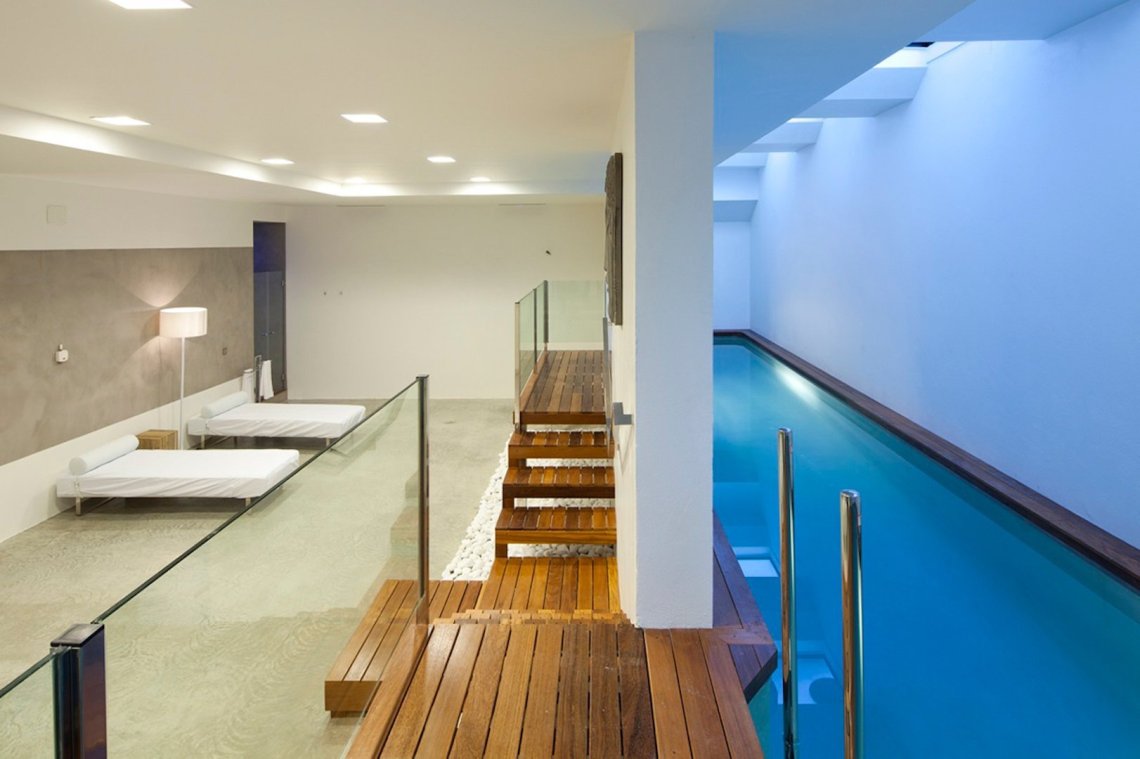 This contemporary residence has a coveted location in the Vista Alegre complex overlooking three of Ibiza’s top beaches: Las Salinas, Es Cubells, and Porroig. Constructed from concrete, this striking minimalist house boasts 7,696 square feet of living space across three levels with six spacious bedrooms and six ultra-modern bathrooms. The home’s designer decor has a chic aesthetic with top-of-the-line finishes and appointments. The master suite has a stunning en suite bathroom with a walk-in spa shower; residents can also retreat to their own climate-controlled spa with daybeds and an indoor pool. The outdoor living areas include an oversized lap pool with a sun deck, and a dining terrace.