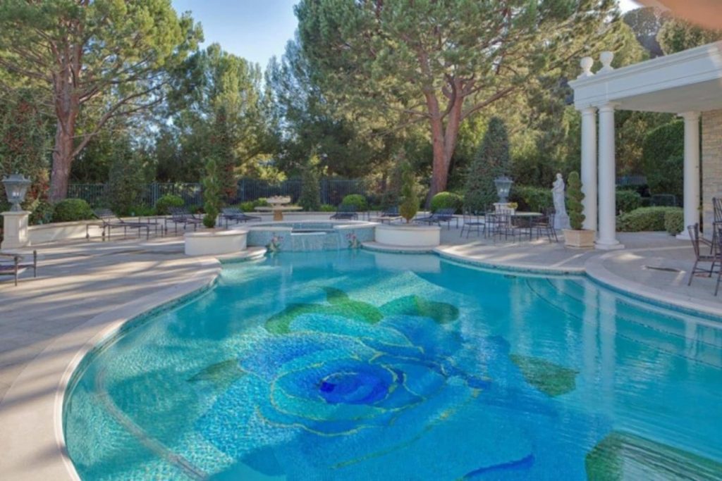 Everything about this pool/spa combination is as custom as possible. The uniquely shaped natatorium houses hand-cut mosaic tile that cannot be replicated. With the blue rose figure as the pool’s centerpiece, even the surrounding area is extravagant, with a custom water feature and full outdoor kitchen.