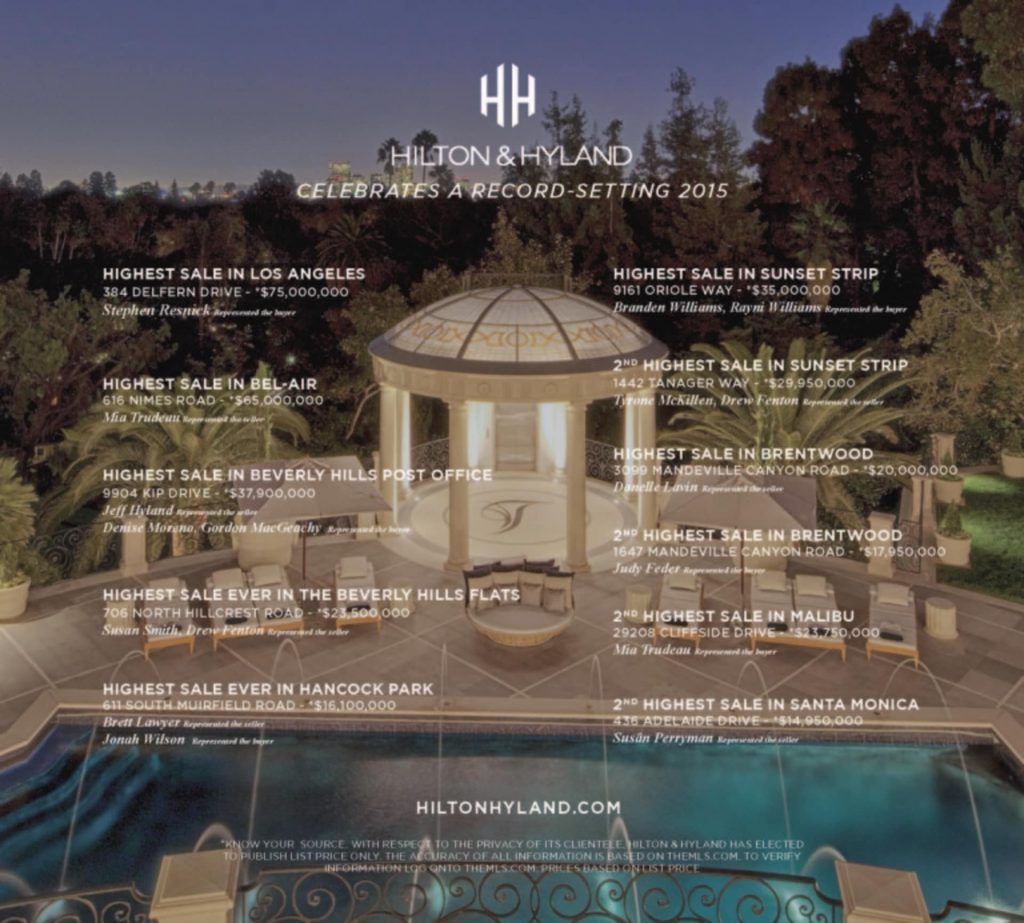 Mia Trudeau enjoyed a magnificent year, which she has carried into 2016. Her 2015, however, was highlighted by the sale of the Liongate Estate. One of the icons of Bel-Air, this home marked the highest sale in Bel-Air for the year.