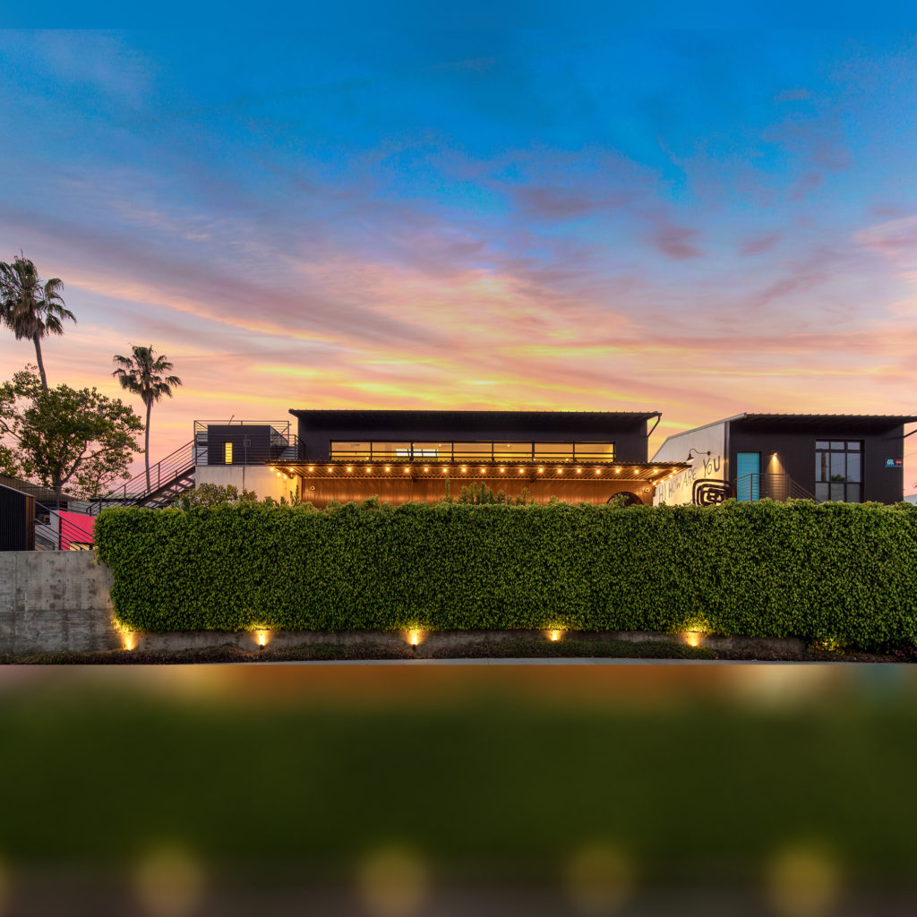 Bursts of pink, orange and green peek out from the sleek corrugated metal shell of the structure. The front of the warehouse-like form was modeled after the loading dock at Bergamot Station, the late 1800s railroad station turned breezy arts center in Santa Monica. A bar located on Austin’s famous Sixth Street also served as inspiration for the industrial vibe.
