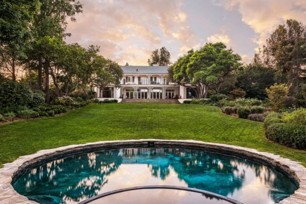 In 1947, Edie Goetz enlisted legendary Hollywood designer Billy Haines to enhance the main house as a showplace for lavish events. One of the most iconic rooms is the paneled art deco modern library and bar also designed by Haines. On what many consider the finest street in Los Angeles, this private paradise is set behind large gates and offers complete privacy. Features of the estate include a verdant manicured grounds, three guest houses, 11 bedrooms, two swimming pools, a tennis court, and rare specimen trees (Mediterranean Palms, Arizona Cypresses and Japanese Maples).