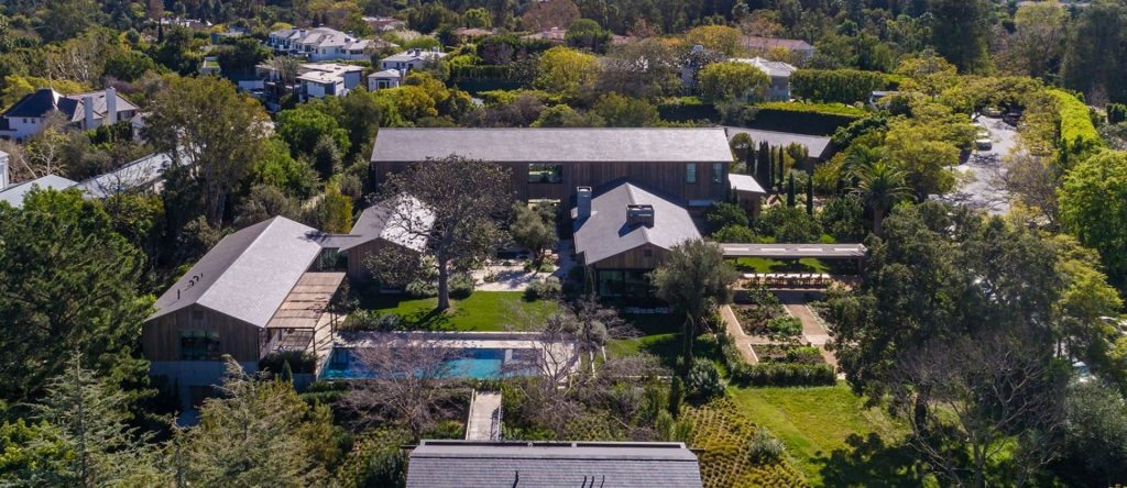 From its wooded barn-like great room to its voluminous living room which transforms into a studio-quality theater, stylish den with a bar and private office, the five bed, 12 bath trophy compound cultivates an immense sense of tranquility throughout.