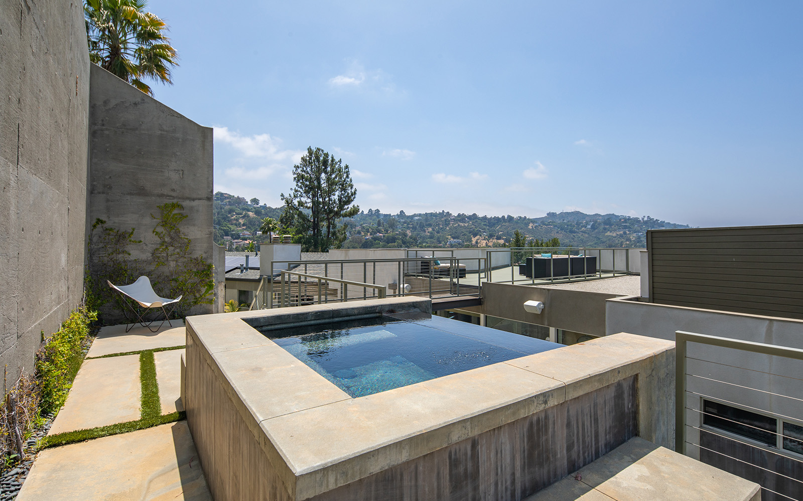 A gourmet chef’s kitchen, dining room, and media room all open to exterior patios. The design captures the indoor-outdoor lifestyle the architect was noted for. The oversized master suite leads to an infinity-edge spa and waterfall. Far-reaching city and hillside views compliment the property from its prime Hollywood Hills location.