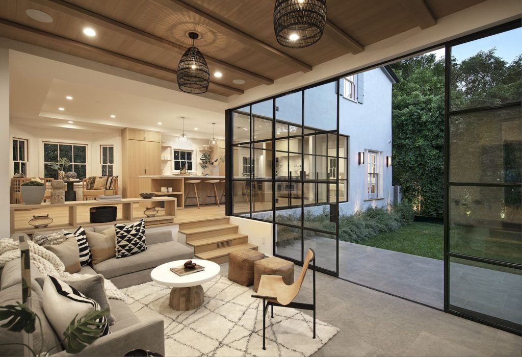 Designed for entertaining, the vast living room opens to a private courtyard with fire feature, seating area and mature olive trees. Inside, the wood-paneled library, sunken family room and gourmet kitchen all open to the rear grounds and infinity edge pool with cabana rivaling the home’s interior for endless entertaining possibilities.