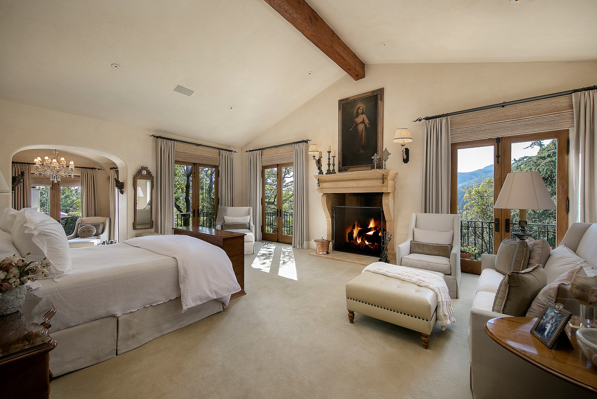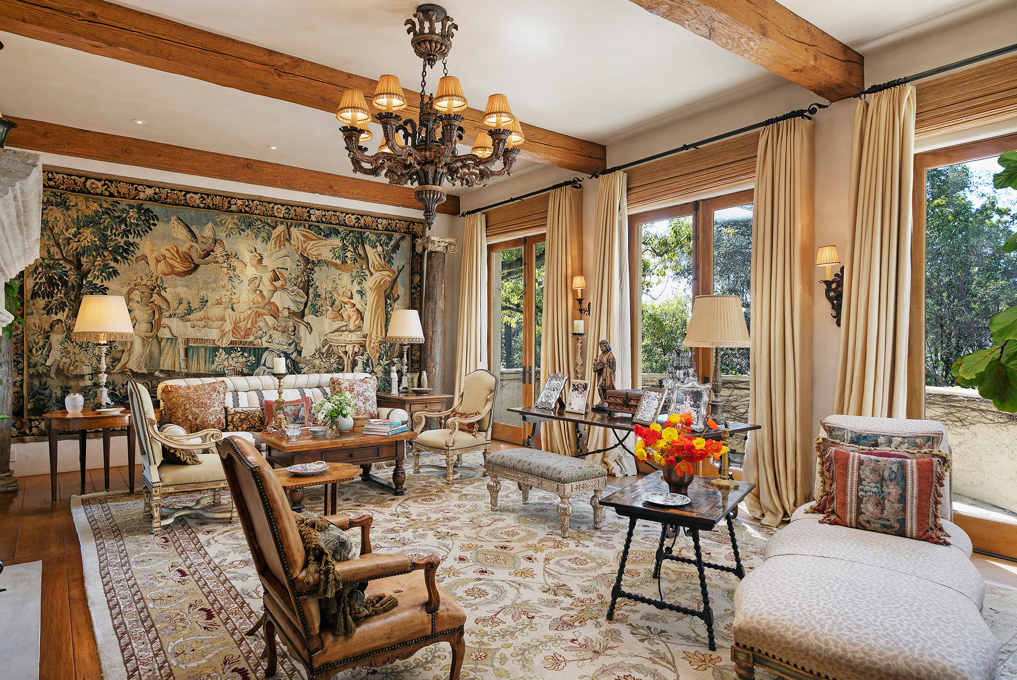 Designed by Los Angeles-based architect Richard Landry, the seven-bedroom main home is inspired by a Florentine villa and includes a family room with beamed ceilings and a large fireplace, formal living and dining rooms, a screening room and a solarium.
