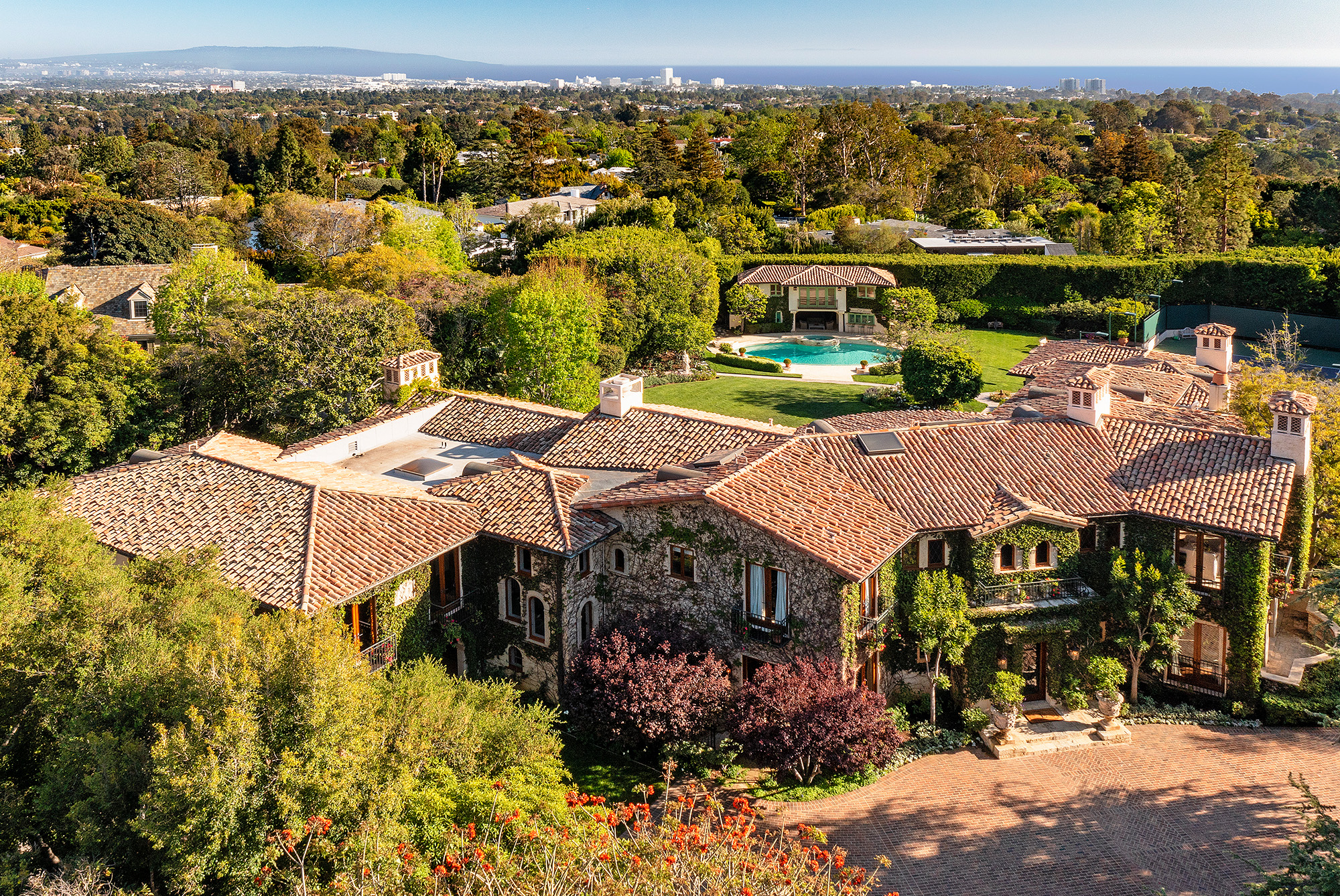 Located in the Pacific Palisades, the home sits on a roughly 1.7-acre lot in an upscale neighborhood known for its high-end country club and for streets named after locations in the French and Italian Riviera, such as Amalfi Drive and Napoli Drive. The roughly 16,700-square-foot property sits behind large gates and is surrounded by expansive grounds that include an oval-shaped pool, a sprawling lawn, a putting green and a tennis court.