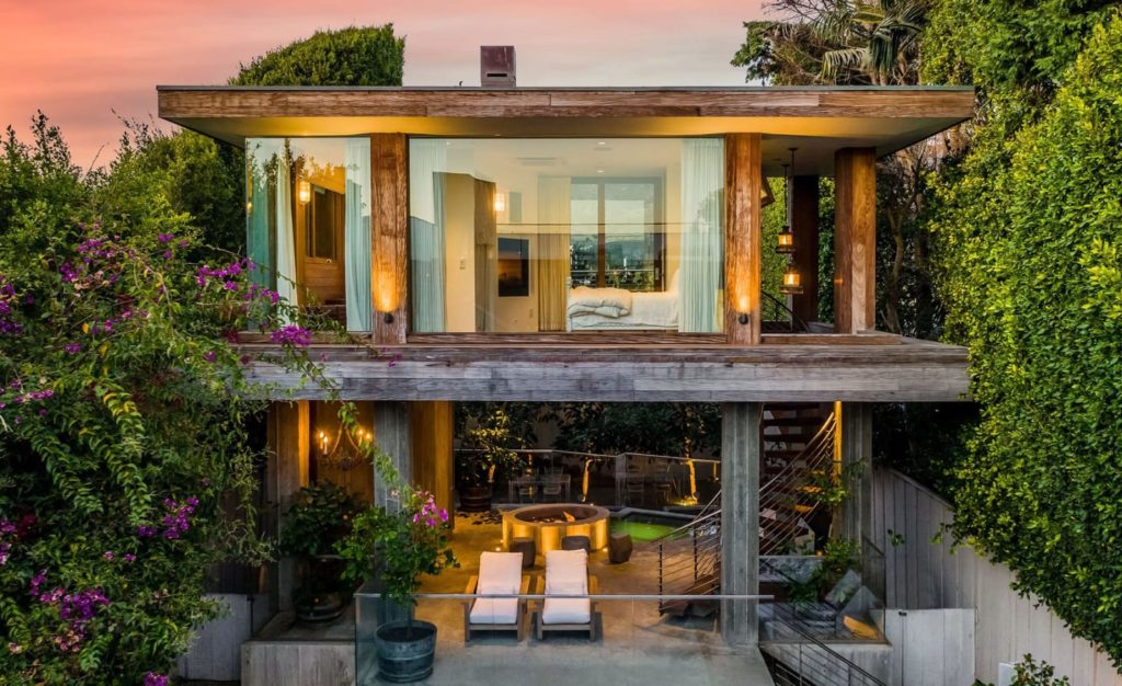 She’s made plenty of changes over the years, replacing the preexisting structure with a 5,500-square-foot main house filled with warm woods and glass and tacking on a one-bedroom guesthouse. Between the two structures, there’s a leafy wood deck with a swimming pool.