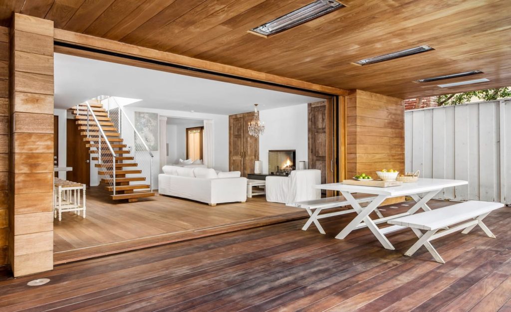 Vibrant teak wood covers the exterior. Inside, highlights include two floating staircases, a chandelier-topped living room and a kitchen with slab stone counters. Throughout the space, walls of glass open outside.
