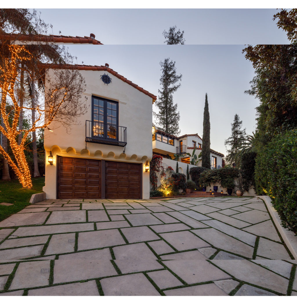 Set on a cul-de-sac, the gated home backs up to Laughlin Park and takes in views of the Griffith Observatory and the Hollywood sign from several Juliet balconies, terraces and picture windows. Cityscape and residential neighborhoods have replaced what were once bean fields and orange groves.
