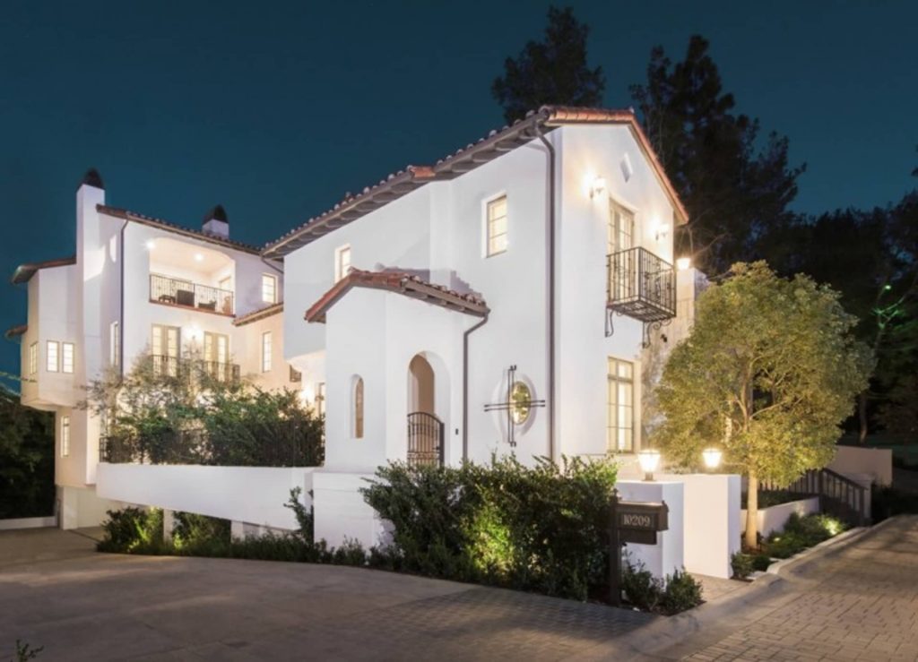 The three-story home comes with an elevator, three-car garage, a private media room and 24-hour guard-gated security.