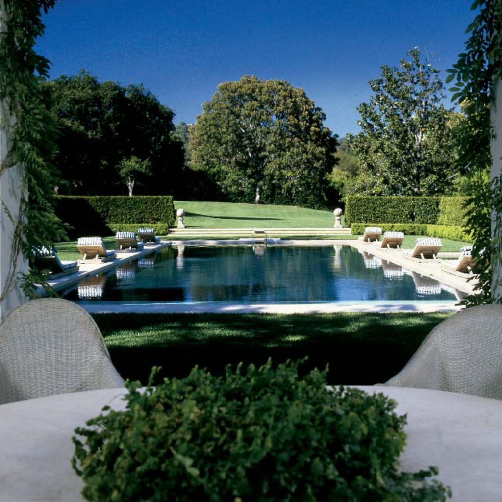 Bordering each terrace and major amenity on the grounds were lush, tall trees that both framed the spaces and created a sense of privacy. Yoch also used tall hedges set close to each other to delineate spaces, provide privacy, and make a garden space seem larger. Entertaining was vital to the Warners, and most of their outdoor entertaining was poolside. Yoch gave the swimming pool a neoclassical pavilion and two large terraces—one where guests could lounge and another that served as an outdoor kitchen, complete with a barbeque and even a soda fountain. She redesigned the stairway leading from the pool to the house and the library/screening room: