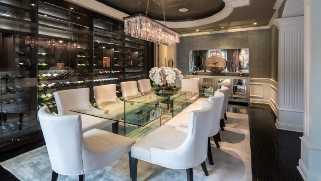 This grand Spanish-influenced estate provides the ideal setting to host the ultimate upscale dinner soirée. Between the mood lighting, beautifully hand-made iron ornamental work, the leather back seats and the attached state-of-the-art wine room, guests will feel they have been transported to their very own private Spanish villa.