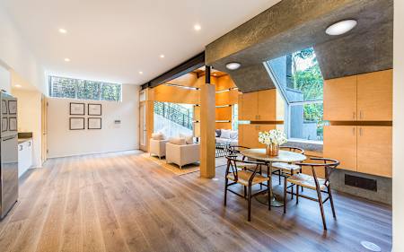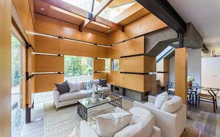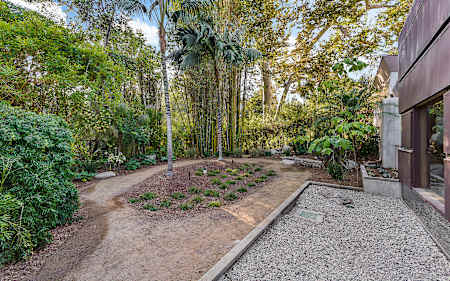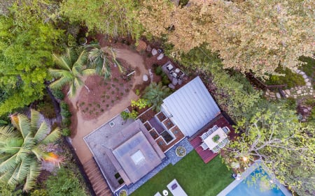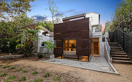 The main residence boasts 5 ensuite beds & 5.5 baths, including the master retreat, which opens to a large balcony overlooking the yard. The open concept kitchen features Calacatta marble countertops, professional-grade appliances & a vast butler’s pantry. The loggia is accessed via La Cantina bi-fold doors that open for year-round alfresco dining on the terrace, complete with an outdoor fireplace, & extends to the lawn, pool/spa & large deck areas. Recognized with a Decade Honor Award in 2006, the detached guest house was a frequent haunt of Frank Gehry, who inspired its cubist design. The 1-bed guest home, comprised of an updated kitchen & living area, is surrounded by landscaping that maximizes its creekside setting, creating a truly serene oasis. Main house is 4,178 SF, Guesthouse is 824 SF. Buyer to verify square footage.