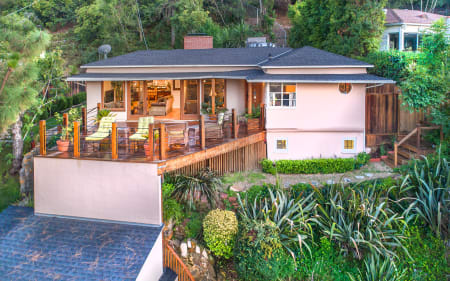 Perched high above the street with amazing 180-degree views of the city, mountains and completely designed for ultimate privacy. From the moment, you step up to the large wood deck you are instantly swept away by the incredible view. Bask in the sun, do yoga or host an intimate soirée, this is the spot to be at. Expanded and updated in 2012 including a top of the line gourmet kitchen and expansive picture windows that highlight the breathtaking views. A cozy fire place anchors the living space and adds to the charm and tranquil vibe this house exudes. Currently, the house is set up as a 2-bedroom 1 bath but can be easily converted back to a 3 bed. Saltio tiles throughout, high ceilings and a great open floor plan make this a great buy. Close to shops, restaurants and all that studio city has to offer, situated just south of the boulevard.