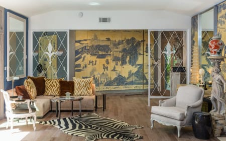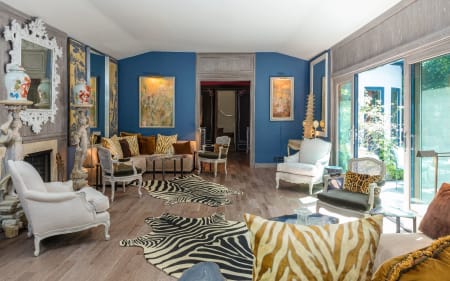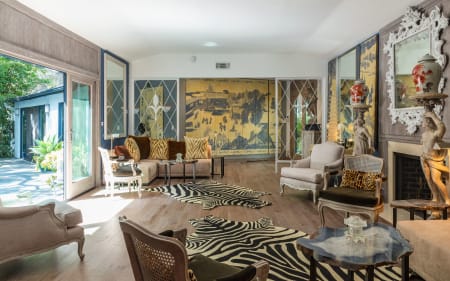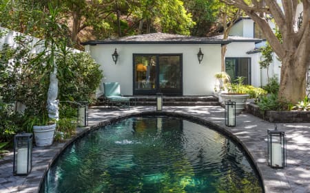 5ba natured filled villa refuge of trees, plants, and foliage with oval pool and fountain feature. An expansive FLR, boasts high ceilings, wood floors, FP and double glass doors that lead to outdoor lush gardens and rear terrace sitting areas. An open layout creates a zen indoor/outdoor flow with glass doors that open from almost every room. A lavish FDR boasts a sitting area, built-in bar and the perfect ambiance for intimate entertaining. The chef’s kitchen features marble countertops, center island and adjoining sitting room and breakfast area. The main floor accommodates the master suite on its own wing with FP, generous closet space, luxurious bathroom with skylight, waterfall shower and soaking tub. There are 2 additional guest ensuite bedrooms downstairs and 1 additional suite upstairs with hardwood floors, sitting area/office. Experience this one-of-a-kind historic part of the Duquette Estate while you still can!