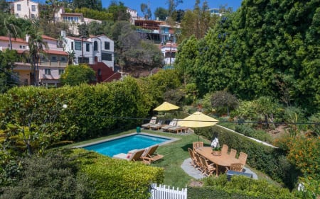 A short walk to incredible dining, shops + hotels. Beautifully appointed with classic period details. Large living rm w/ fireplace + adjacent study. French doors, dark wood flrs, formal dining room. Kit w/ center island and sunny breakfast room. 2nd floor w/ an over-sized master suite, large walk-in closet + city views. 2 additional family bedrooms + family/media room.Unique grounds include a large yard, beautiful pool, sculpted hedges + specimen trees. 2 car garage w/ bonus room for gym/studio.