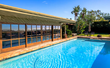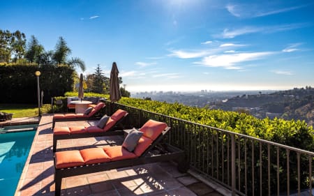 The ivy accented exterior lends itself to a private, secluded feel. Though, seclusion does not compromise the undeniable openness of its interior — large windows inundate the home with light, accentuating its spaciousness. The 4,261 sq ft living area offers 4 bedrooms, 4 bathrooms, large multipurpose rooms, and a beautiful kitchen featuring breakfast nook and an island centerpiece. Step outside or sit poolside and admire breathtaking views of the ocean, the canyon-side and the LA cityscape.