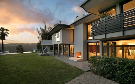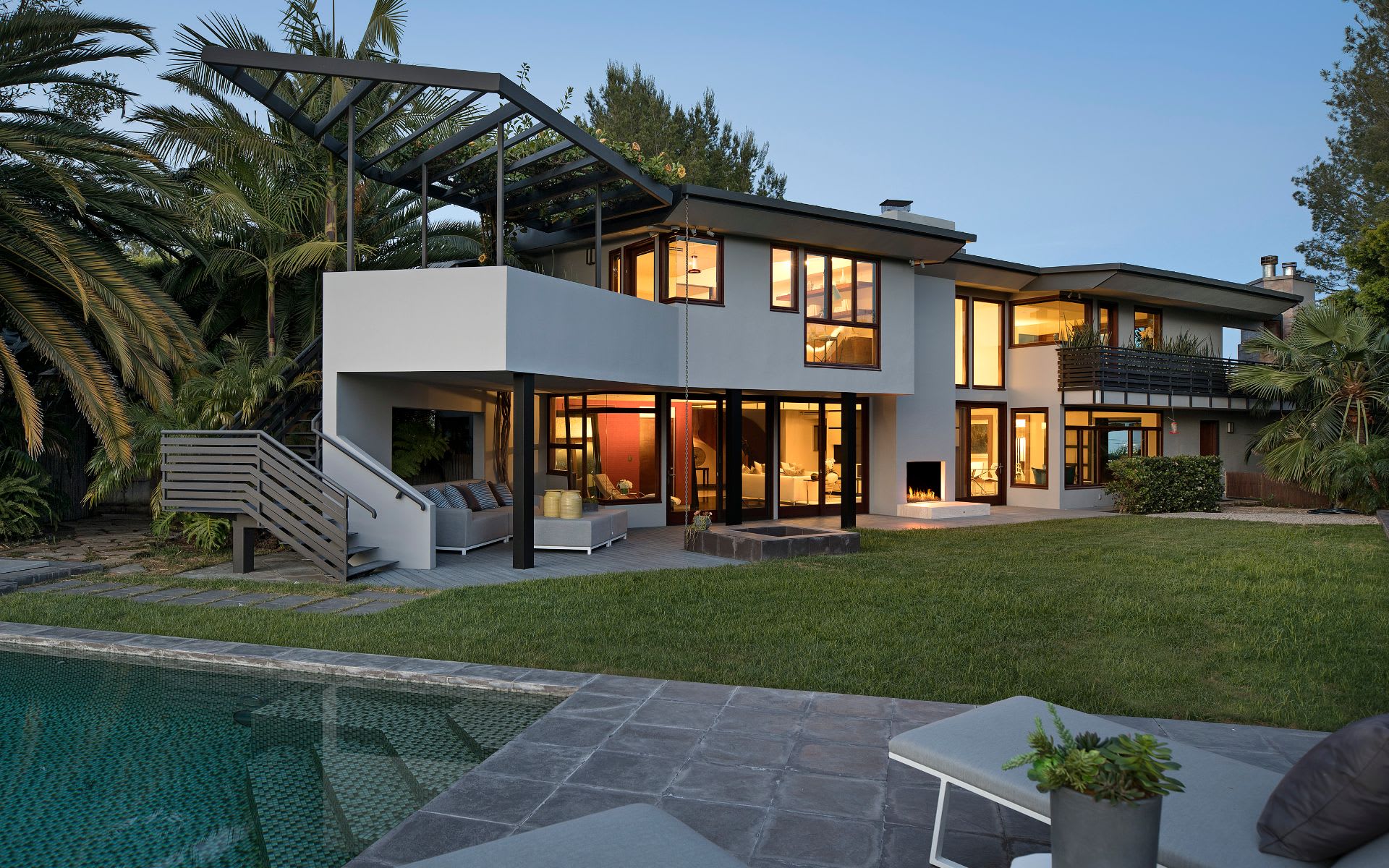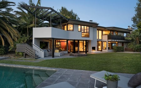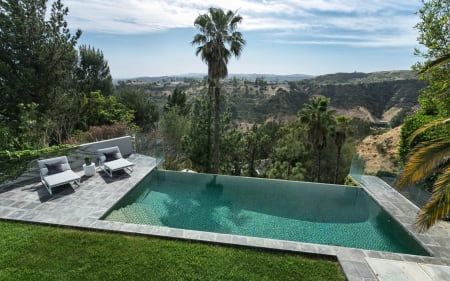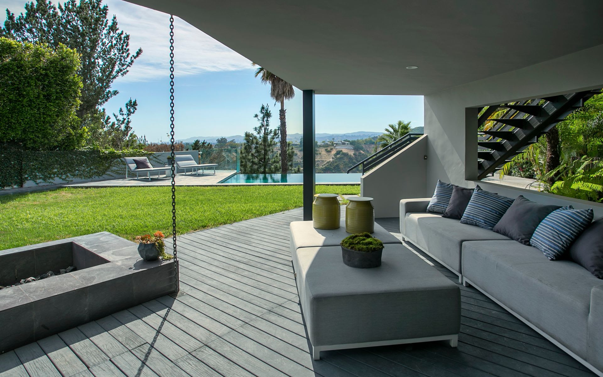 BHPO Modern with large grassy yard and infinity edge pool. Soaring 2 story living room, sweeping curved staircase, formal dining room and spectacular gourmet kitchen flowing to vast outdoor terrace. 5 bedrooms/ 4 baths. Master Suite with lavish stone bath and uplit onyx counter tops. Scenic canyon views as well as Downtown Los Angeles. Surrounded by $20M+ estates.