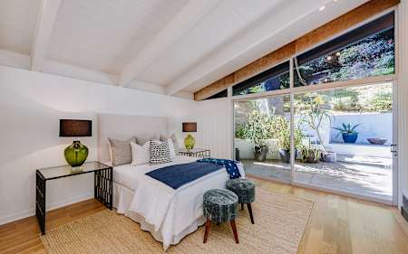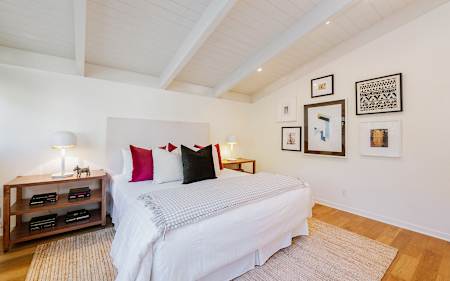 Gated courtyard entry. Great period architectural elements. Loft-like living room w/ vaulted wood ceilings, parquet floors, interior stone wall and central courtyard overlooking private pool. Large open kitchen w/ center island. Media room and 2 master bdrm suites.