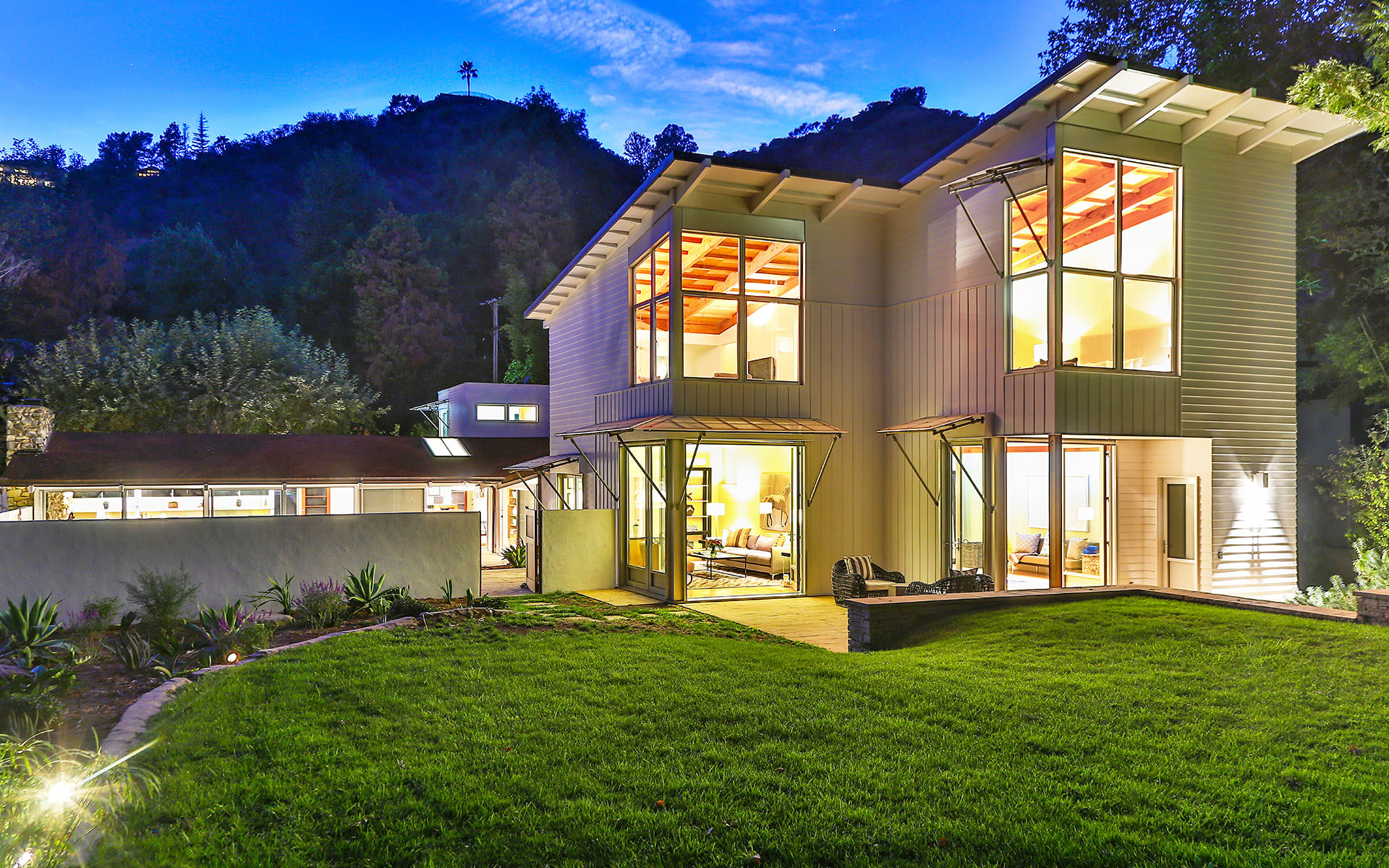 Set on nearly 1.5 acres, this private Mid-Century estate with modern additions is a one-of-a-kind offering. Clerestory windows and skylights flood the interior with natural light from all angles and lend an architectural edge to the spaces. Walls of Fleetwood sliders open from the main wing to incredible central courtyard for fluid indoor/outdoor living & entertaining. Sweeping expanse of grass and shaded trees set against a backdrop of the canyon-side is the highlight of the property. Features pool & spa, gym, guest house. 6 bed, 5.5 bath.