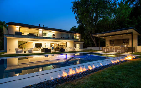 A grand, ambiently lit entry welcomes you into this warm, modern, open concept home that immediately flows into quintessential LA indoor/outdoor living through 40 ft automated Fleetwood glass doors opening to large lush backyard, a covered outdoor kitchen, in-ground infinity edge pool and spa, perfect for large scale entertaining.