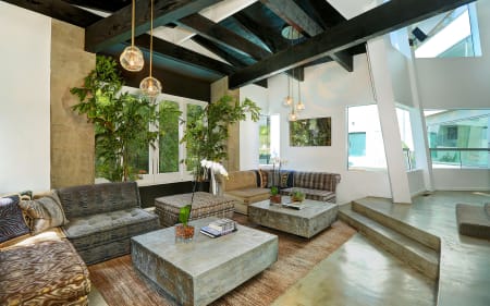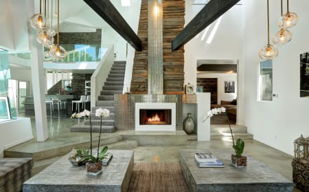 Expansive scale with vaulted wood beamed ceilings, a large master suite and bath with poured concrete vanity, living and dining rooms, and a kitchen perfect for entertaining. The house seamlessly transitions to the outside entertaining area with multiple sitting areas, water features, infinity pool & spa and cantilevered deck over the pool, perfect for entertaining!