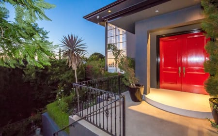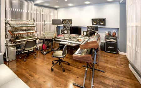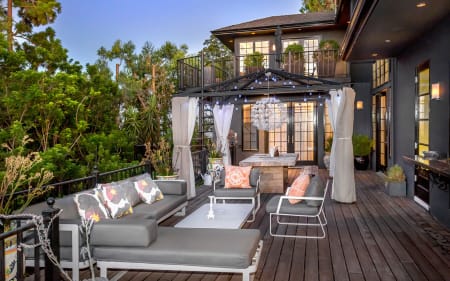 Enter through the double red doors to the world class grand living room with 18 ft ceilings and walls of glass revealing city lights and canyon views. A brilliant eat in kitchen with adjacent family room abounds with style and class and opens to the pool on one side and a wrap around deck/lounge area on the other side. A den/music room is 2 stories with the 2nd floor outfitted as a professional recording studio. The 2 story master suite has a double height bay window and is a world unto its own. There are 3 additional bedrooms. The attached guest suite has a private entrance and spans 2 floors. The pool area is private, sexy and has an outdoor shower. The gated motor court provides ample parking and the wrap around decks offer breathtaking city and mountain views. Located close to Hollywood, Downtown, Sunset Strip, hiking and bike paths.