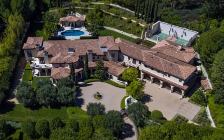 Nestled within Beverly Hills‘ most prestigious private enclave is a sprawling Tuscan-inspired villa in which classic beauty meets sleek modern living. Resting on nearly two lush acres is a grand motor court leading to the stately 17,000-square foot luxurious living space. European architectural elements include imported limestone, soaring 30 foot ceilings, Italian travertine floors, and hand-painted murals. Outdoor loggias line the home’s expansive seven bedrooms, thirteen bathrooms, and lavish common areas. A once-in-a-lifetime entertainer’s dream, the estate makes extraordinary use of an opulent 12-seat theater, two story guesthouse, pool, spa, cabana, steam sauna, and outdoor sport court.