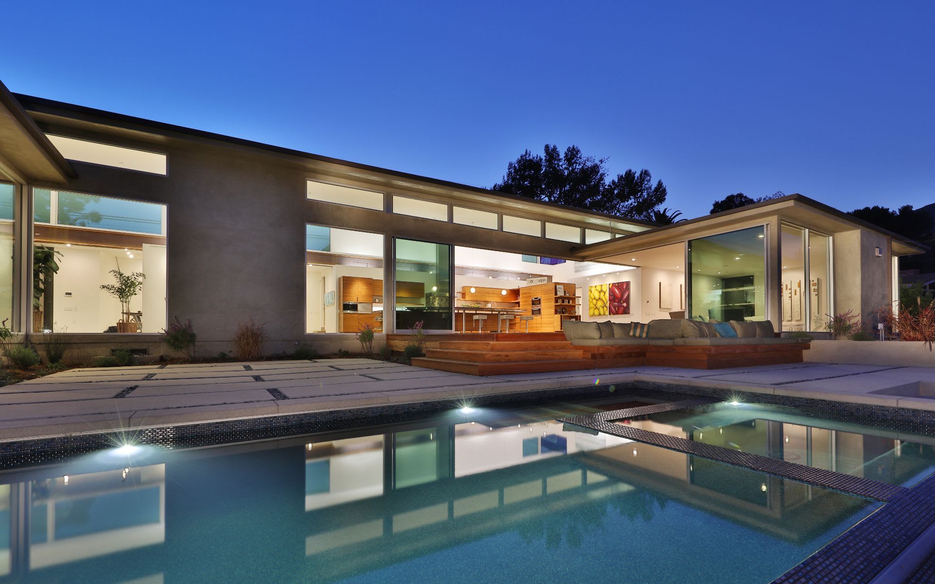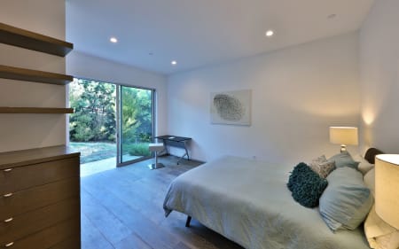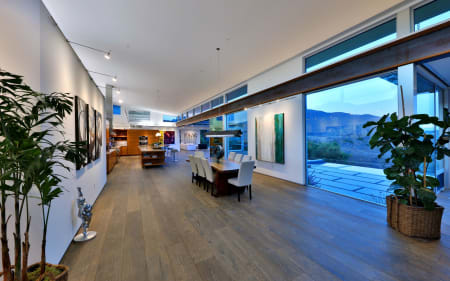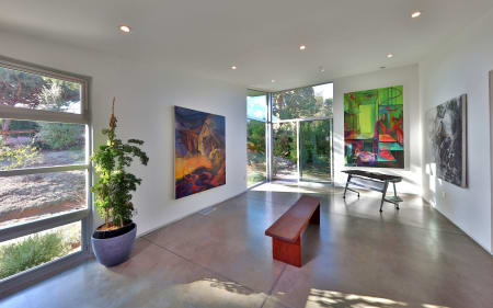 From the 6×10 custom corten steel pivot entry door to custom cabinetry throughout every room, the home exudes the passion of his design, attention to detail and quality construction. Wide plank oak floors and custom cabinets provide warmth and beauty for the dramatic open living space framed by two exposed 86' steel beams. Special lighting to accent art or sets a calm evening mood next to the fireplace while taking in the view through the floor to ceiling Fleetwood windows and doors. A floating corner bank of doors open off the Fresco kitchen and family room to a deck to double your entertainment area. Conveniently located w/easy access to mountain trails, 1 ½ miles from schools, restaurants, and golf cart ride or bike to beach.