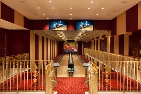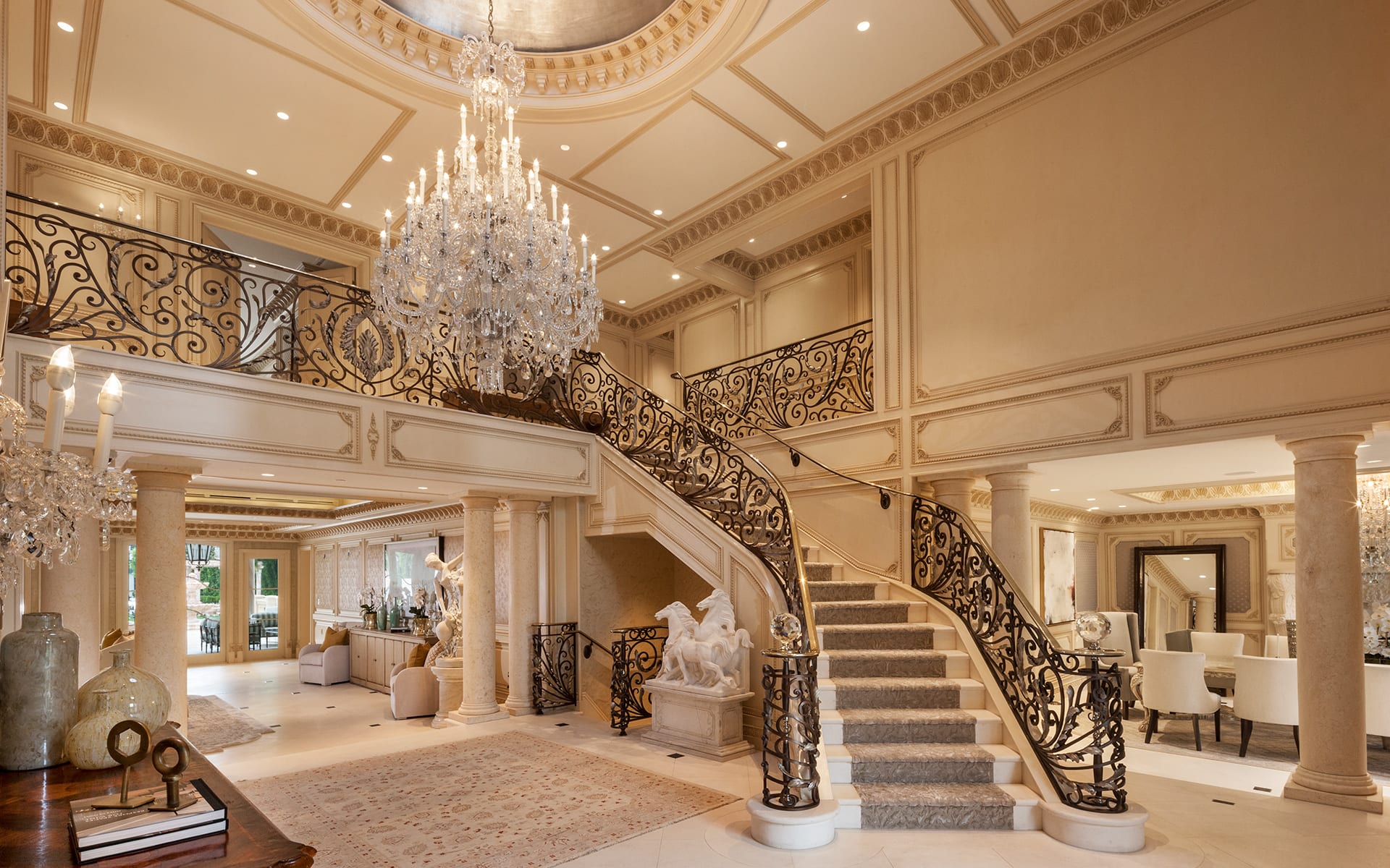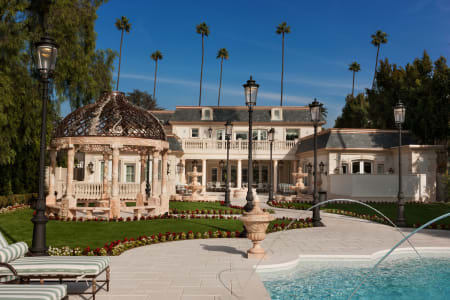 Sited on one of the deepest lots with over 350 feet deep and 60 feet wide in the “Golden Flats,” it offers approximately 21,000+ square feet of lavish detail and amenities including 7 bedroom suites, master suite with outdoor Jacuzzi, dual baths and closets. 2 family rooms, breathtaking kitchen, paneled library, state-of-the-art theatre with star roof, indoor basketball court, beauty salon, Qubica AMF 2 lane Bowling Alley, gym, multiple imported fireplaces, self-contained 1-bedroom guest house, resort-size swimming pool and spa, commercial elevator and the most advanced, orchestrated lighting, sound and security systems imaginable with strategically placed acoustical upgrades throughout. 20 Zones of HVAC which includes special air filtration units and humidity control and Lifesource water treatment system throughout.