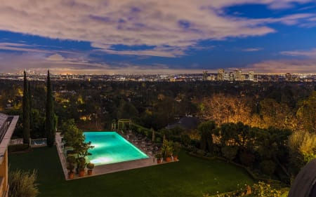 The property provides a scale and size no longer allowed in Bel Air and has sprawling gardens and grounds and views from downtown to the ocean, a true 280 degree panorama. A completely private and gated estate over 35k feet on 2.2 acres with 2 master suites and 8 additional bedrooms plus staff and offers a professional screening room, grand ballroom, 5000+ bottle wine cellar, loggia and terraces, infinity pool, spa, 14 fireplaces, elevator, Moroccan room, Turkish hummam, gym, card room, commercial kitchen and much more. Shown to pre-qualified buyers only.