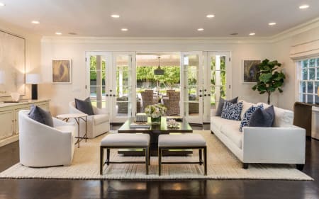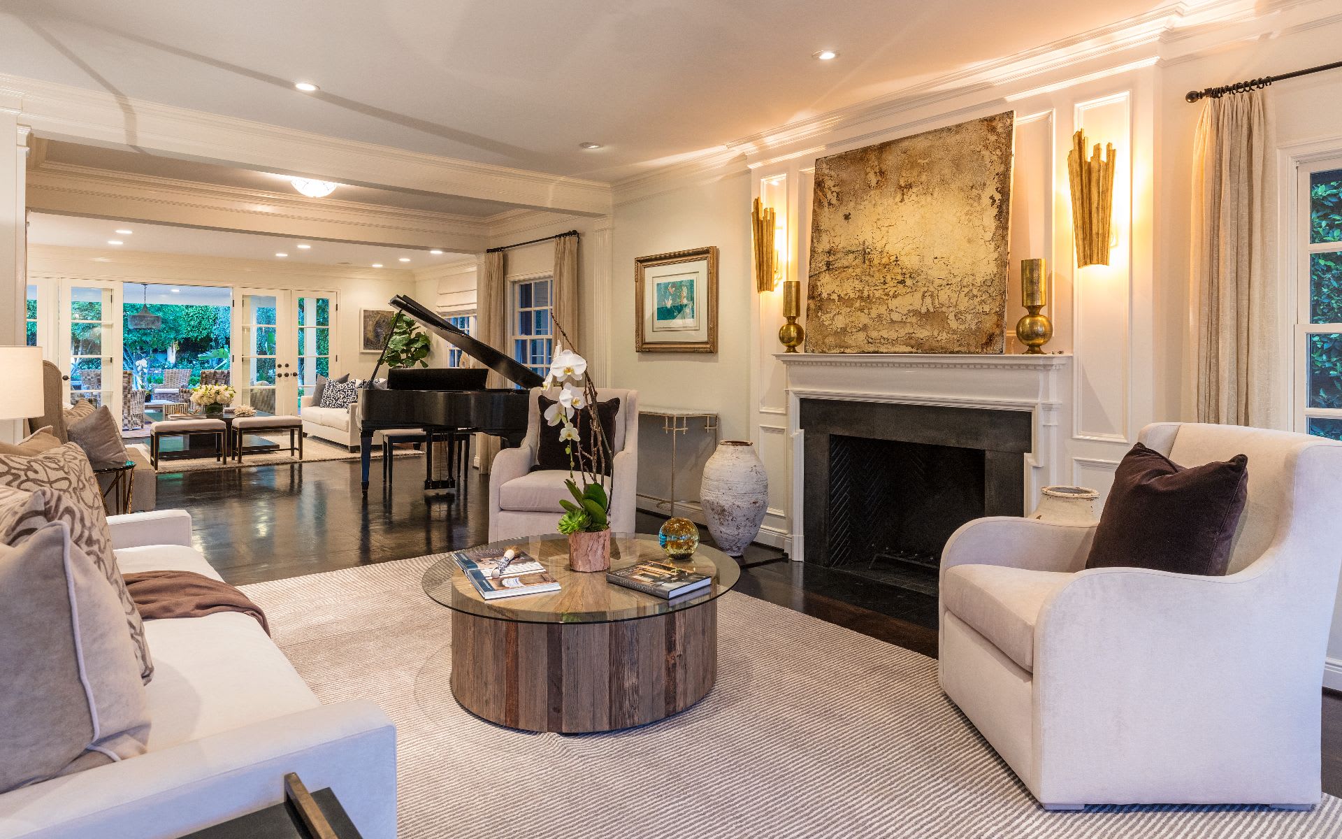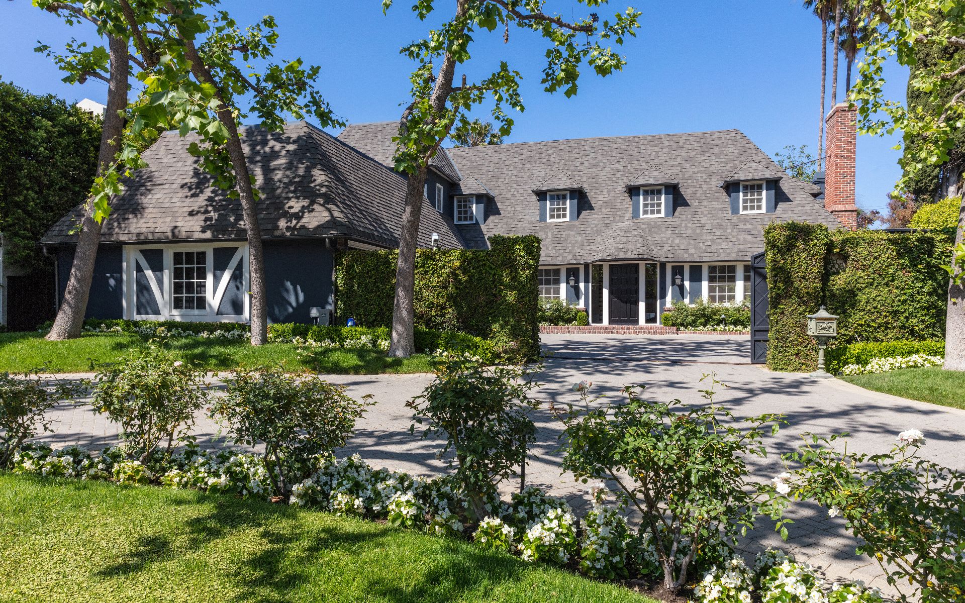 Spectacular large back yard. Impeccable layout with wonderful open kitchen/family room, gracious formal living areas. Covered loggias lead out to gorgeous lawn, pool and spa. Front and back stairways lead to 4 ensuite bedrooms including master suite with fireplace, terrace and his & hers baths. Additional guest room downstairs. A truly exceptional offering in prime Beverly Hills flats location.