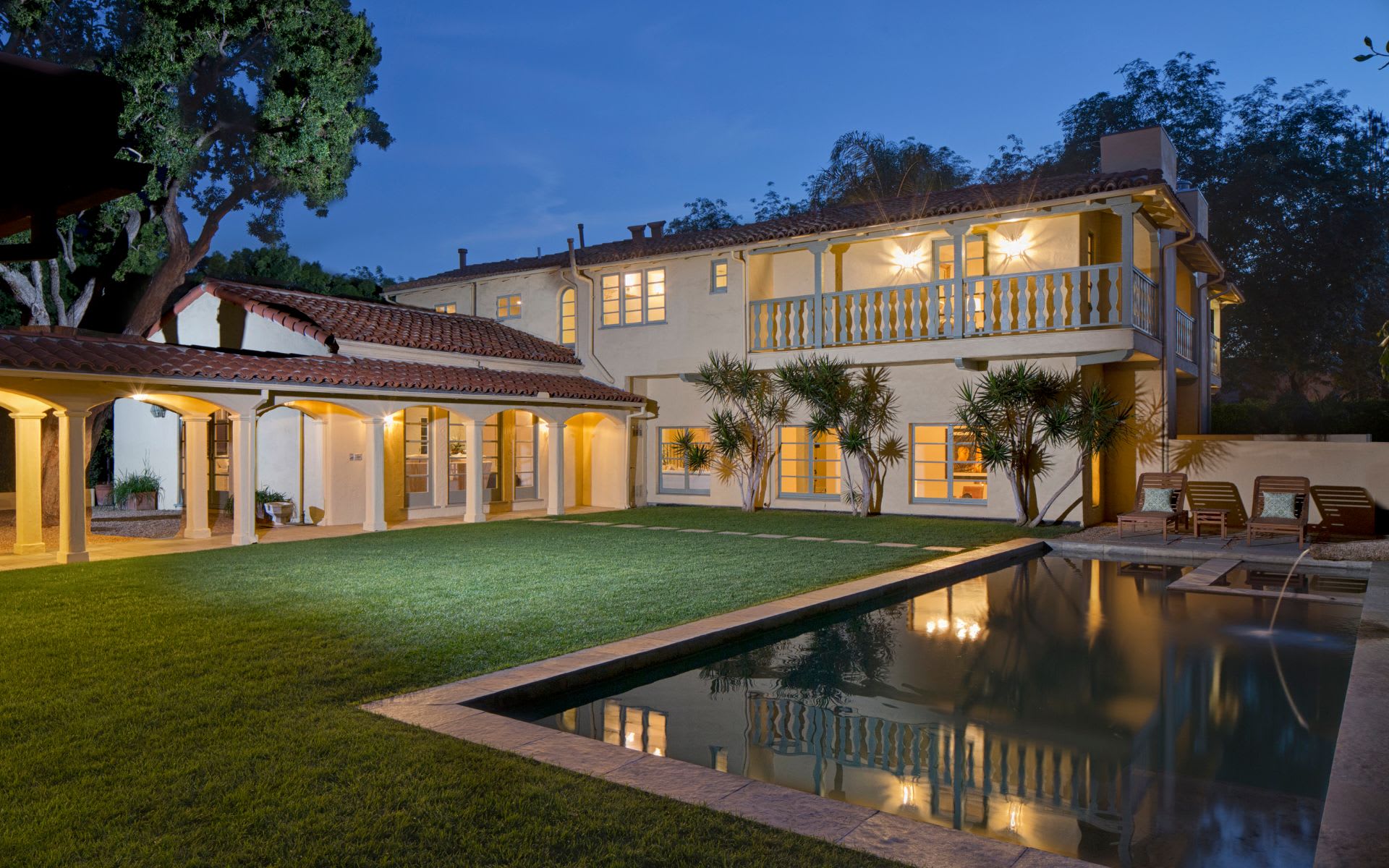 Main house consists of 5 bedrooms on suiten, formal living and dining room. Family room with open beam ceilings. Eat-in kitchen. French doors leading to private lawns with pool, zen rock garden and a spacious grassy area to entertain. Master bedroom has sitting room with fireplace and separate his and hers bathrooms. Two story guest house with separate entry has 2 bedrooms upstairs plus office along with top of line chef kitchen. 3 car garage. Available furnished please contact agent.Also available furnished at $45,000/m.