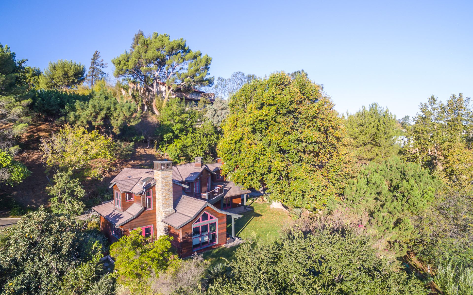 Main house w/3 bedrooms upstairs inc. master w/fireplace, balcony & spectacular views. Living room w/cathedral ceilings, along w/kitchen & breakfast room all open to the gardens &city views. A rich wood paneled library w/fireplace & a home theater. Across the walkway is a 2 bedroom guest house (versatile office space) overlooking the grounds &views. Upstairs guest suite w/separate entry, living room, kitchen & views. Walk down to the fitness center (light-filled 2-story gym w/steam room). Additional sun-drenched structure w/full kitchen can function as a studio, guest suite, pool house etc.. & a large aviary (or re-purpose as a greenhouse, grow organic vegetables). Wind down to the pool w/Jacuzzi, BBQ/kitchen, fire pit & seating area w/city & cyn views. A private and serene 5-star retreat just minutes from the heart of the city below.