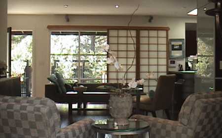 Master bedroom suite with a walk-in closet & private entrance to large, entertaining deck. Master bath room has a steam shower & sunken tub. Kitchen includes stainless steel appliances & burnt granite counter tops. Distressed hardwood floors & rock glass stainless steel fireplace. Entertainment system. No details left out in this enchanting private retreat. Feels like a W hotel. Third bedroom has been turned into an office.