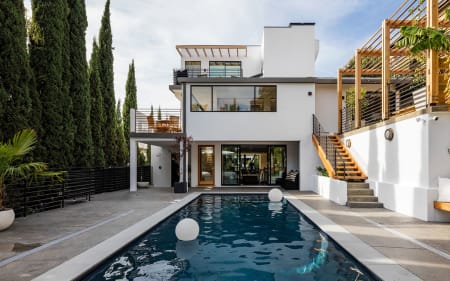 Ives residence. This modern retreat is hidden down a long gated drive on a rare street-to-street lot among the coveted bird streets, just above the Sunset Strip. The captivating architecture boasts extraordinary light and scale throughout. A two-year, multi-million renovation was just completed with exquisite craftsmanship and attention to detail. The spectacular pool and surrounding terraces are perfect for entertaining and lounging. Sophisticated open floor plan on multiple levels include a family room and chef’s kitchen with adjacent dining terraces, 3 bedrooms and 3 1/2 full baths. A magnificent master suite commands the entire upper level and boasts wall-to-wall picture windows with heart stopping, downtown-to-ocean views. A very special offering and rare opportunity.