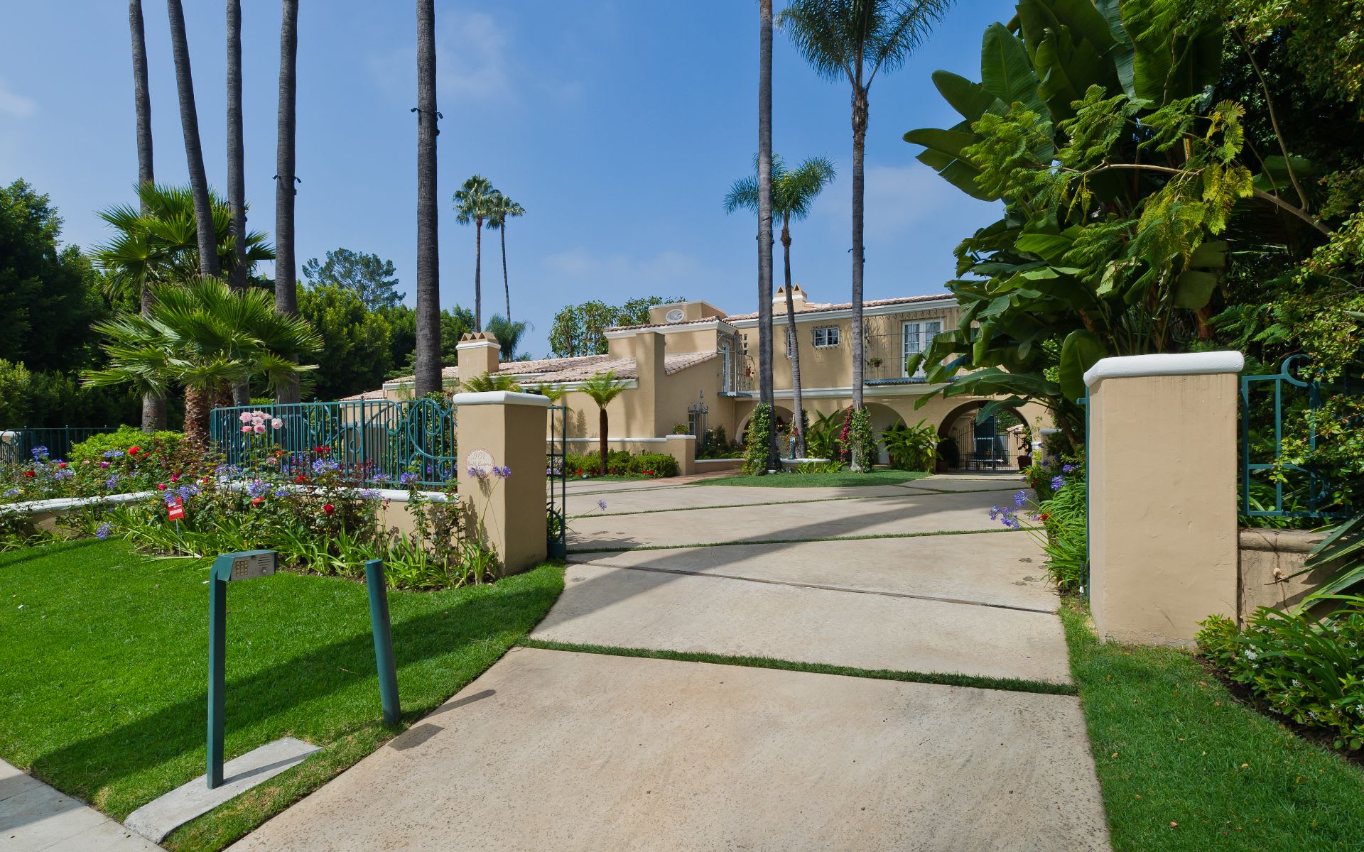 Gated Spanish Colonial with resort-like grounds featuring tennis court, lush landscaping, large patio, pool and spa.